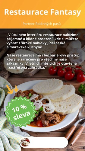 5 % sleva na útratu v restauraci (vyjma alkoholu) nad 200 Kč při platbě v hotovosti.